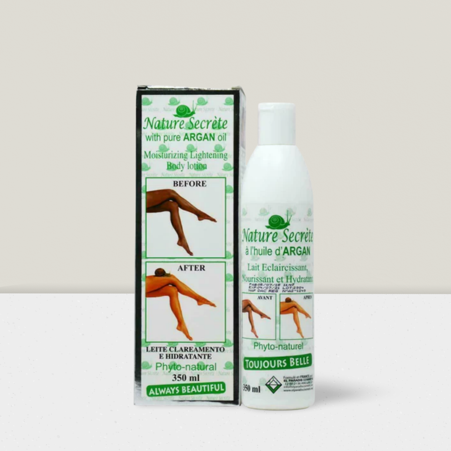 La lotion corporelle éclaircissante Nature Secrète à l’huile d’Argan pure offre une luminosité incomparable à votre peau. Sa formule enrichie en huile d’Argan et en extraits végétaux éclaircissants cible efficacement les taches d’hyperpigmentation, aide à prévenir leur réapparition et unifie progressivement le teint.