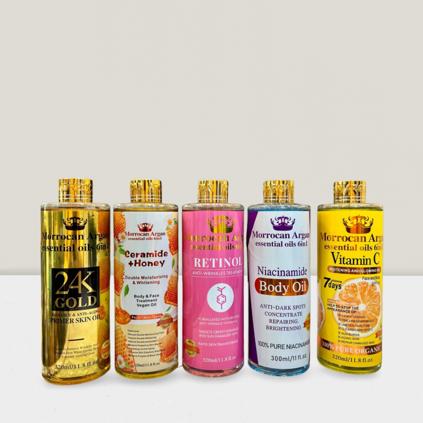 La gamme d’huiles corporelles Moroccan Argan Essential 6 en 1 est disponible en :