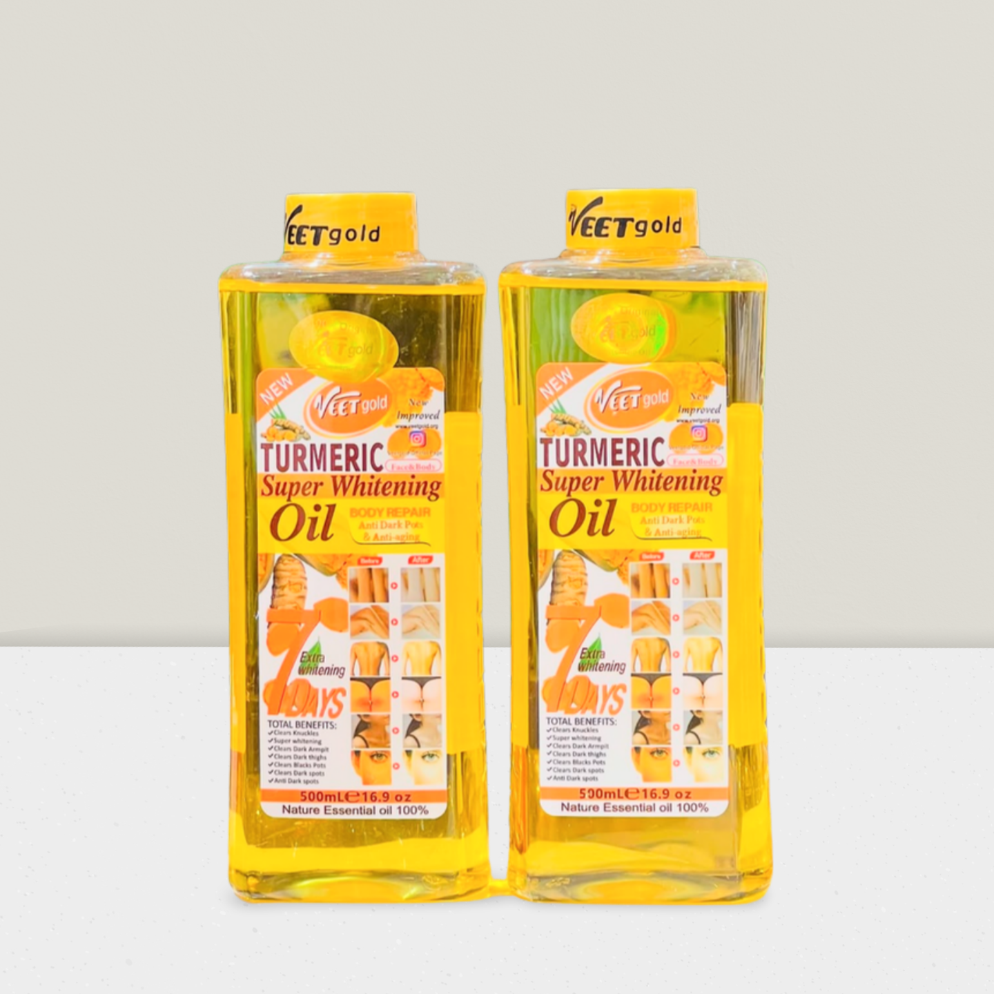 L'huile éclaircissante Turmeric SUPER WHITENING OIL 1000ml de la marque VEET GOLD est un soin de beauté qui utilise le pouvoir du curcuma pour offrir des résultats visiblement plus clairs et uniformes.
